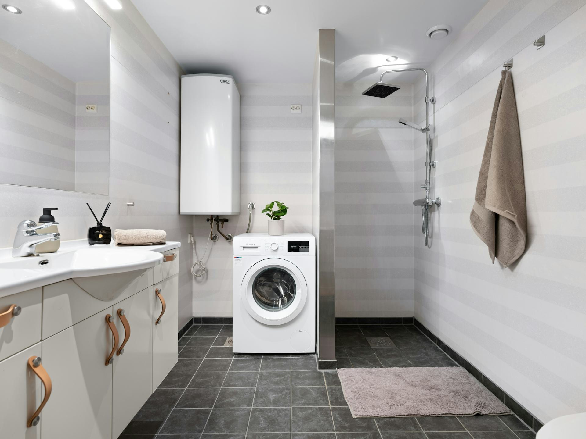 Hvis du har mulighed for det, så vælg ophængte løsninger – for eksempel en vægmonteret tørretumbler eller et lille fryseskab på sokkel. Det giver luft under apparaterne og gør det nemt at komme til.